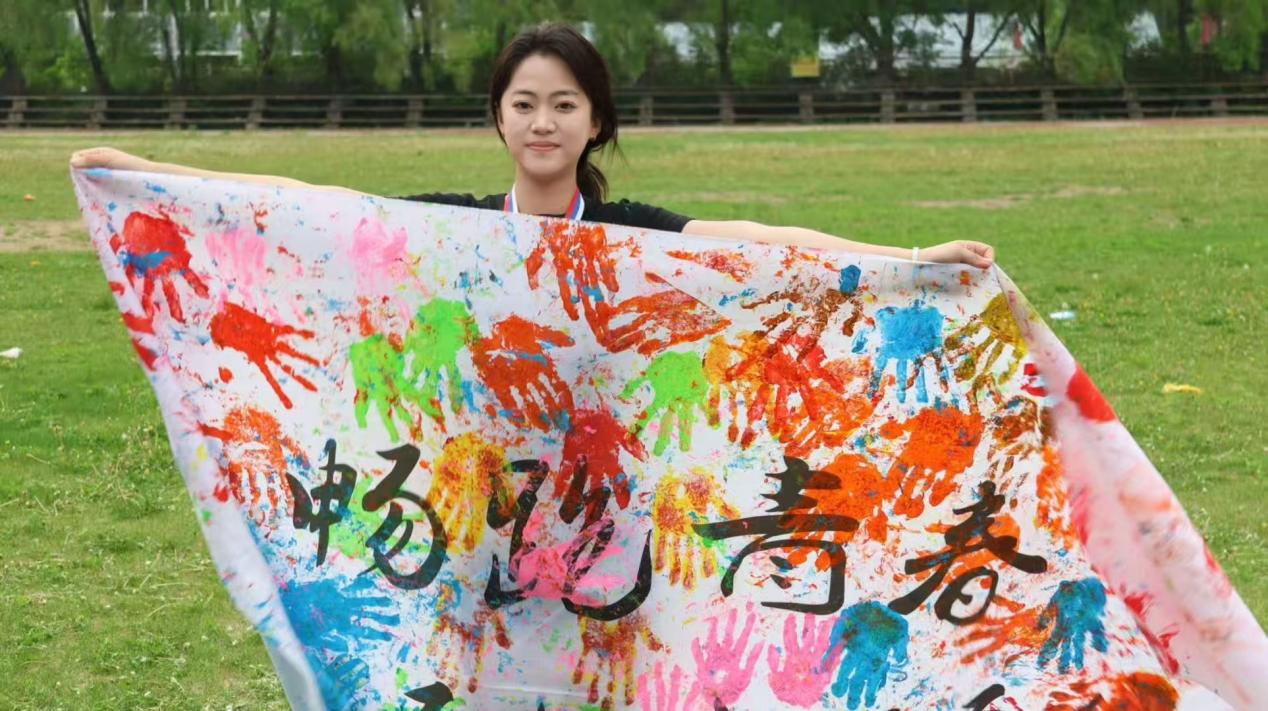 在終點(diǎn)處別具一格的“掌上青春”環(huán)節(jié)中,每位完賽者在白色旗幟上留下五彩手印,共同繪制出充滿拼搏與團(tuán)結(jié)的青春畫(huà)卷。