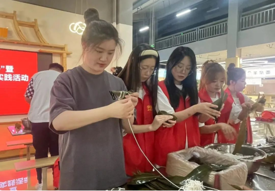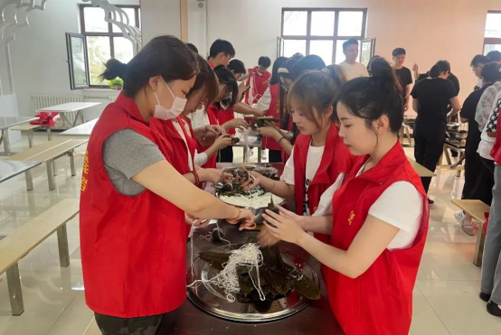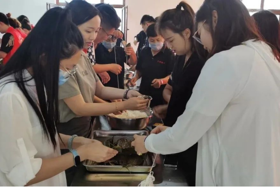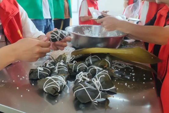 大家在包粽子過程中,輕輕地聞著粽葉香,細(xì)細(xì)的琢磨著包粽子的方法,也在真情的聊著關(guān)于端午的故事和傳統(tǒng)文化,互相學(xué)習(xí)包粽子的技巧,盡管大家的包粽子水平參差不齊,但無論是技術(shù)嫻熟還是新手上路,同學(xué)們都帶著真情實感沉浸在親手包粽子的愉悅中,粽葉飛舞,巧手翻飛,經(jīng)過大家的辛勤勞作,一個個粽子相繼成型。