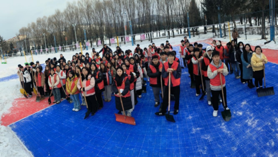 青年志愿者賣力的揮動手中的鏟雪工具,他們用熱情融化冰雪,用行動溫暖校園,“紅馬甲”穿梭在體育場中,形成了一道亮麗的風(fēng)景線。志愿者們積極的對體育場路面進(jìn)行劃片分組,各司其職、團(tuán)結(jié)協(xié)作。經(jīng)過一下午的辛勤勞動,體育場的積雪和冰層很快被清理干凈,為師生打造出安全寬敞的體育運(yùn)動場所。
