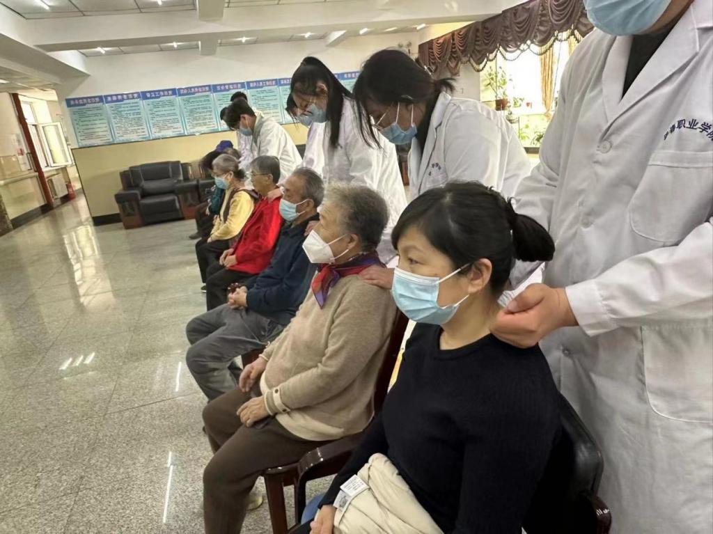 活動中,我們的志愿者與老人交流中得知老人在這里生活條件雖好,但卻缺少兒女的陪伴。志愿者們一起陪老人促膝交談,同他們聊家常,噓寒問暖,詢問老人們的衣食起居和身體狀況,并用他們所學(xué)得技能幫助老人緩解病痛。志愿者隊伍的同志們用真切的行動讓老人們感受到了愛和溫暖。