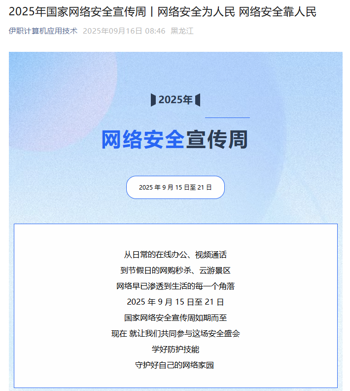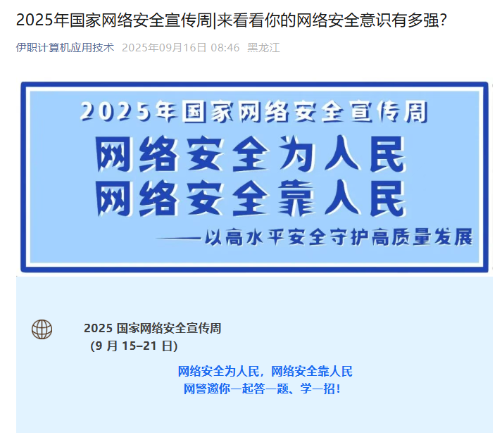 我院還依托“伊職計算機(jī)應(yīng)用技術(shù)”公眾號拓寬宣傳渠道,以互動形式吸引師生參與,擴(kuò)大活動影響力,方便師生獲取網(wǎng)絡(luò)安全知識。