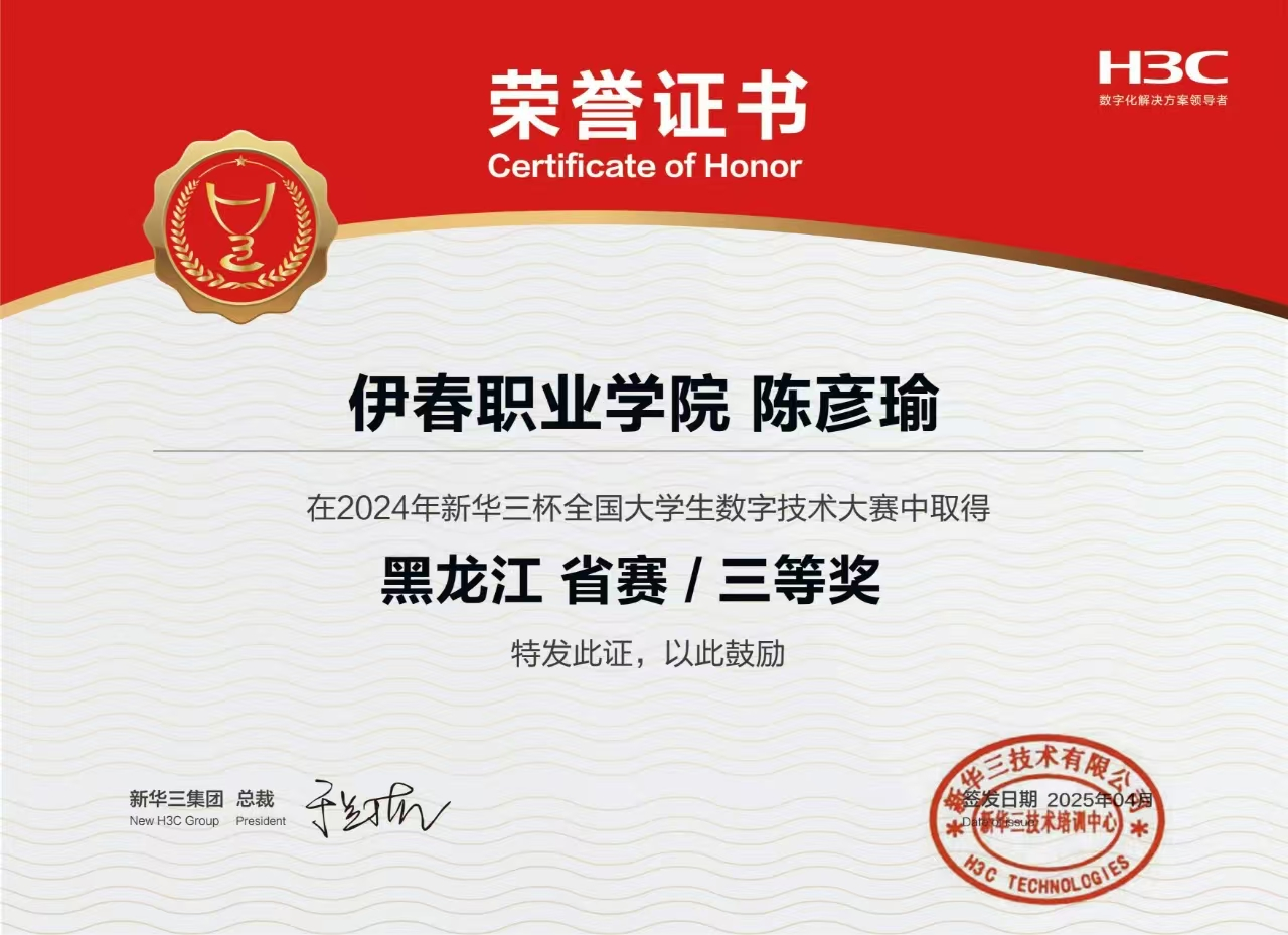 3月15日,2024-2025年第十四屆“新華三杯”全國(guó)大學(xué)生數(shù)字技術(shù)大賽黑龍江賽區(qū)復(fù)賽圓滿落幕。我院2023級(jí)計(jì)算機(jī)應(yīng)用技術(shù)專業(yè)學(xué)生史旭、陳彥瑜在比賽中分別榮獲二等獎(jiǎng)、三等獎(jiǎng)的好成績(jī)。