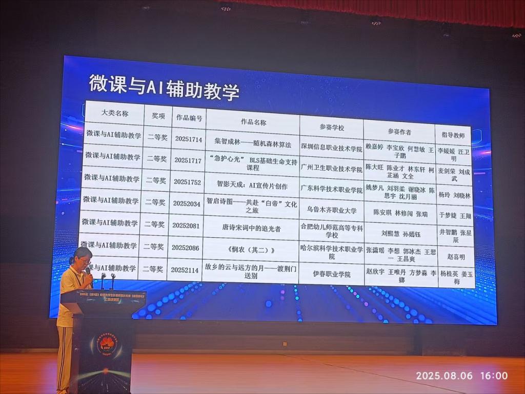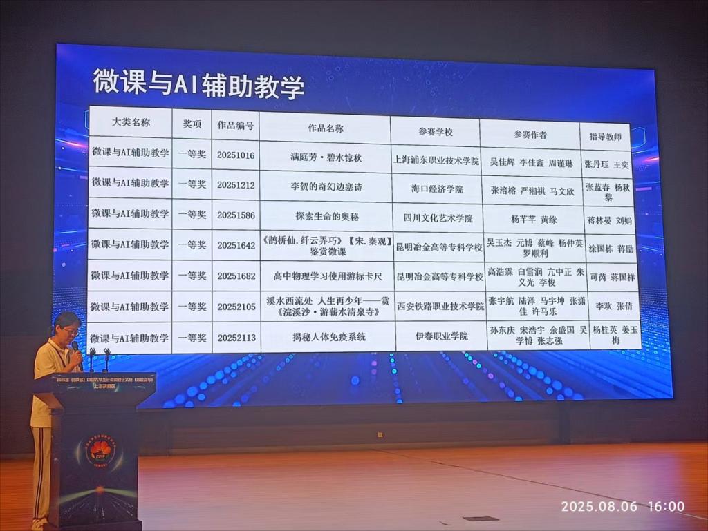 2025年8月3日至6日,第三屆中國(guó)大學(xué)生計(jì)算機(jī)設(shè)計(jì)大賽(高職高專組)全國(guó)決賽在上海出版印刷高等??茖W(xué)校奉賢校區(qū)隆重舉行。本屆大賽匯聚了全國(guó)170余所高校的六大類400多件優(yōu)秀作品。經(jīng)過兩天緊張的激烈角逐,伊春職業(yè)學(xué)院選送的“微課與AI輔助教學(xué)”類兩件作品,分別斬獲一等獎(jiǎng)和二等獎(jiǎng),成為賽場(chǎng)矚目的焦點(diǎn)。