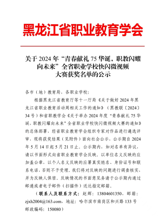 近日,由黑龍江省職業(yè)教育學(xué)會(huì)主辦的“青春獻(xiàn)禮75華誕,職教閃耀向未來”全省職業(yè)學(xué)??扉W微視頻大賽獲獎(jiǎng)名單正式公布。在校黨委宣傳統(tǒng)戰(zhàn)部的組織下,全校師生積極報(bào)名參加快閃微視頻大賽,他們利用專業(yè)知識(shí),積極創(chuàng)作,主動(dòng)對(duì)接比賽要求,經(jīng)過參賽師生的共同努力,我校共獲得一等獎(jiǎng)1項(xiàng)、二等獎(jiǎng)10項(xiàng),三等獎(jiǎng)12項(xiàng)。其中我院獲得一等獎(jiǎng)1項(xiàng)、二等獎(jiǎng)3項(xiàng)、三等獎(jiǎng)6項(xiàng)。