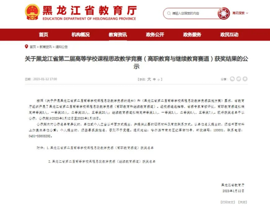 近日,《黑龍江省第二屆高等學(xué)校課程思政教學(xué)競賽(高職教育與繼續(xù)教育賽道)獲獎結(jié)果公示》發(fā)布,公共教學(xué)部教師王建紅榮獲一等獎。