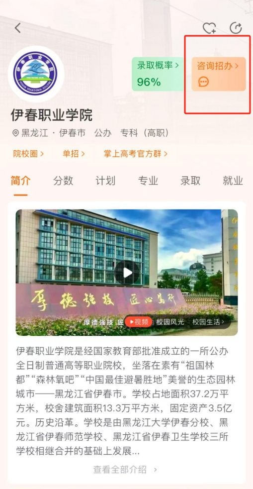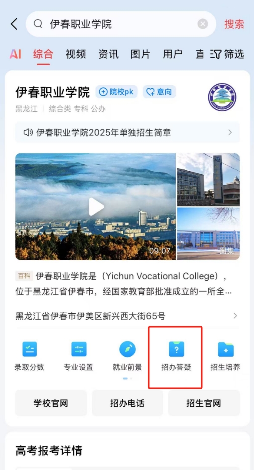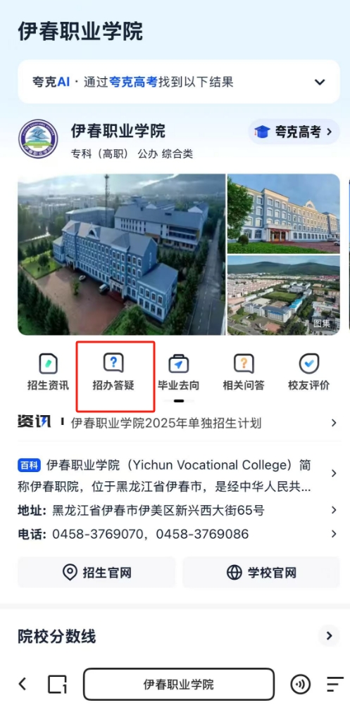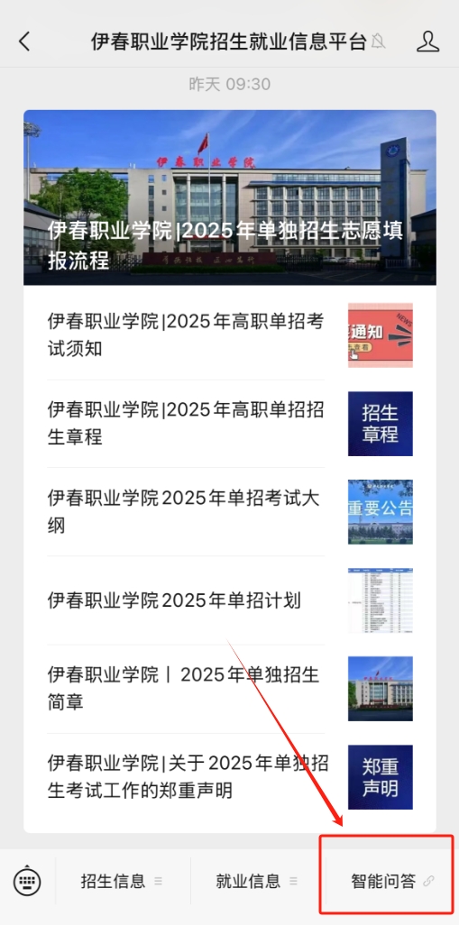 關(guān)注后可進入到“【伊春職業(yè)學(xué)院招生就業(yè)信息平臺】”微信公眾號主頁,點擊底欄“智能問答”即可在線咨詢。公眾號招生咨詢平臺問答頁同時支持語音提問。
