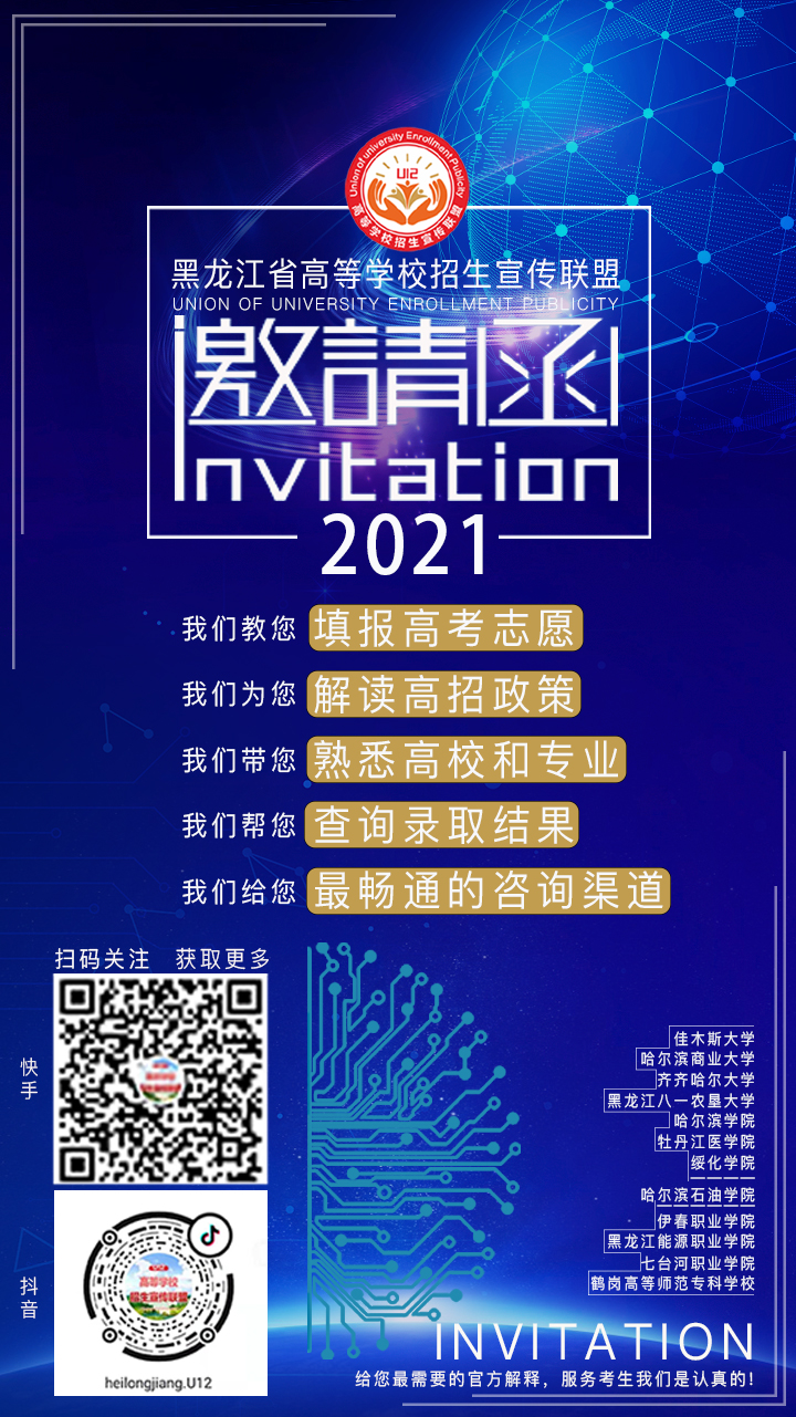 2021年是中國共產(chǎn)黨建黨100周年。結(jié)合我校黨史學習教育“學黨史、悟初心、辦實事、開新篇”的要求,由伊春職業(yè)學院、黑龍江能源職業(yè)學院、七臺河職業(yè)學院、鶴崗高等師范??茖W校、佳木斯大學、哈爾濱商業(yè)大學、齊齊哈爾大學、黑龍江八一農(nóng)墾大學、哈爾濱學院、牡丹江醫(yī)學院、綏化學院、哈爾濱石油學院等十二所學校共同組建U12黑龍江省高等學校招生宣傳聯(lián)盟。著力解決黑龍江省高考考生志愿填報、政策咨詢、專業(yè)選擇、錄取查詢等實際問題,U12聯(lián)盟高校聯(lián)合入駐快手、抖音平臺,我們會以短視頻、直播等形式開展相關(guān)服務,誠邀黑龍江省高考考生及家長關(guān)注,及時獲取最有效的高考訊息。