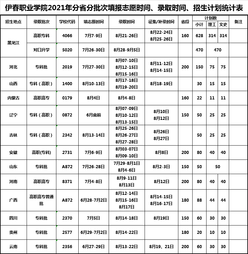 伊春職業(yè)學(xué)院2021年分省分批次填報(bào)志愿時(shí)間、錄取時(shí)間、招生計(jì)劃