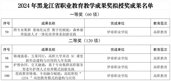 近日,黑龍江省教育廳發(fā)布了《關(guān)于2024年黑龍江省高等教育(本科、研究生)和職業(yè)教育教學(xué)成果獎(jiǎng)擬授獎(jiǎng)成果的公示》。經(jīng)單位申報(bào)、專家評(píng)審、教學(xué)成果獎(jiǎng)評(píng)審委員會(huì)審議,我校喜獲職業(yè)教育教學(xué)成果一等獎(jiǎng)1項(xiàng),二等獎(jiǎng)3項(xiàng)。其中,《跨專業(yè)集群 基地化運(yùn)營(yíng) 數(shù)字化賦能:森林康養(yǎng)旅游人才一體化培養(yǎng)體系創(chuàng)新實(shí)踐》榮獲一等獎(jiǎng);《思政教育鑄魂,專創(chuàng)融合賦能:高院職校“1234”雙創(chuàng)教育模式的建構(gòu)與應(yīng)用》《護(hù)教協(xié)同、交叉融通:基于專業(yè)集群高職服務(wù)型老年護(hù)理人才培養(yǎng)模式創(chuàng)新實(shí)踐》《鑄魂強(qiáng)基、五策同行:高職大學(xué)英語(yǔ)5C課堂新形態(tài)建構(gòu)與應(yīng)用的九年實(shí)踐》榮獲二等獎(jiǎng)。