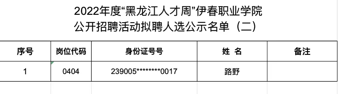 附件:2022年度“黑龍江人才周”伊春職業(yè)學(xué)院公開(kāi)招聘活動(dòng)擬聘人選公示名單(二)
