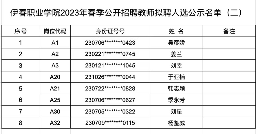 附件:伊春職業(yè)學(xué)院2023年春季公開招聘教師擬聘人選公示名單(二)