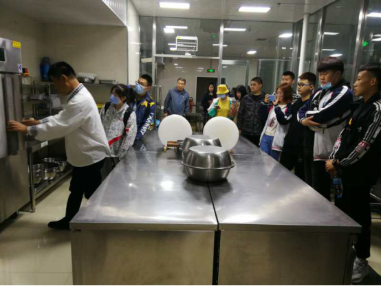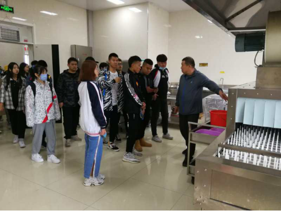 會后學生對食堂廚房餐具的洗消、主副食品的制作流程進行全程參觀,并了解了采購、食品留樣等相關內(nèi)容。