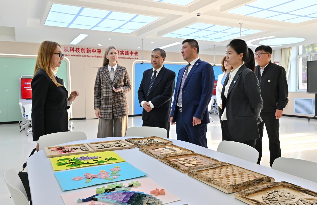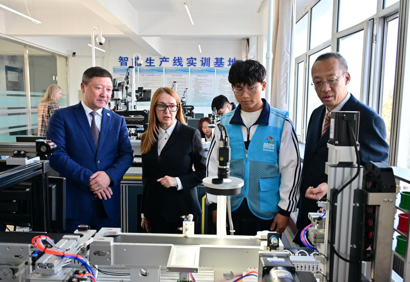 巴熱諾娃一行在院長(zhǎng)王春海的陪同下,參觀了工程應(yīng)用技術(shù)學(xué)院智慧化生產(chǎn)技能實(shí)訓(xùn)室和機(jī)器人實(shí)訓(xùn)室、附屬幼兒園、師范學(xué)院智慧教室、口腔醫(yī)學(xué)院虛擬仿真實(shí)訓(xùn)室以及護(hù)理學(xué)院技能實(shí)訓(xùn)室,深入了解了學(xué)院在職業(yè)教育方面的特色與成果。在工程應(yīng)用技術(shù)學(xué)院智慧化生產(chǎn)技能實(shí)訓(xùn)室,俄方代表對(duì)學(xué)院將機(jī)器視覺(jué)、運(yùn)動(dòng)控制等技術(shù)融入教學(xué)的創(chuàng)新實(shí)踐表現(xiàn)出濃厚興趣,現(xiàn)場(chǎng)觀摩了學(xué)生運(yùn)用全新設(shè)備進(jìn)行仿真生產(chǎn)線全流程操作的演示。