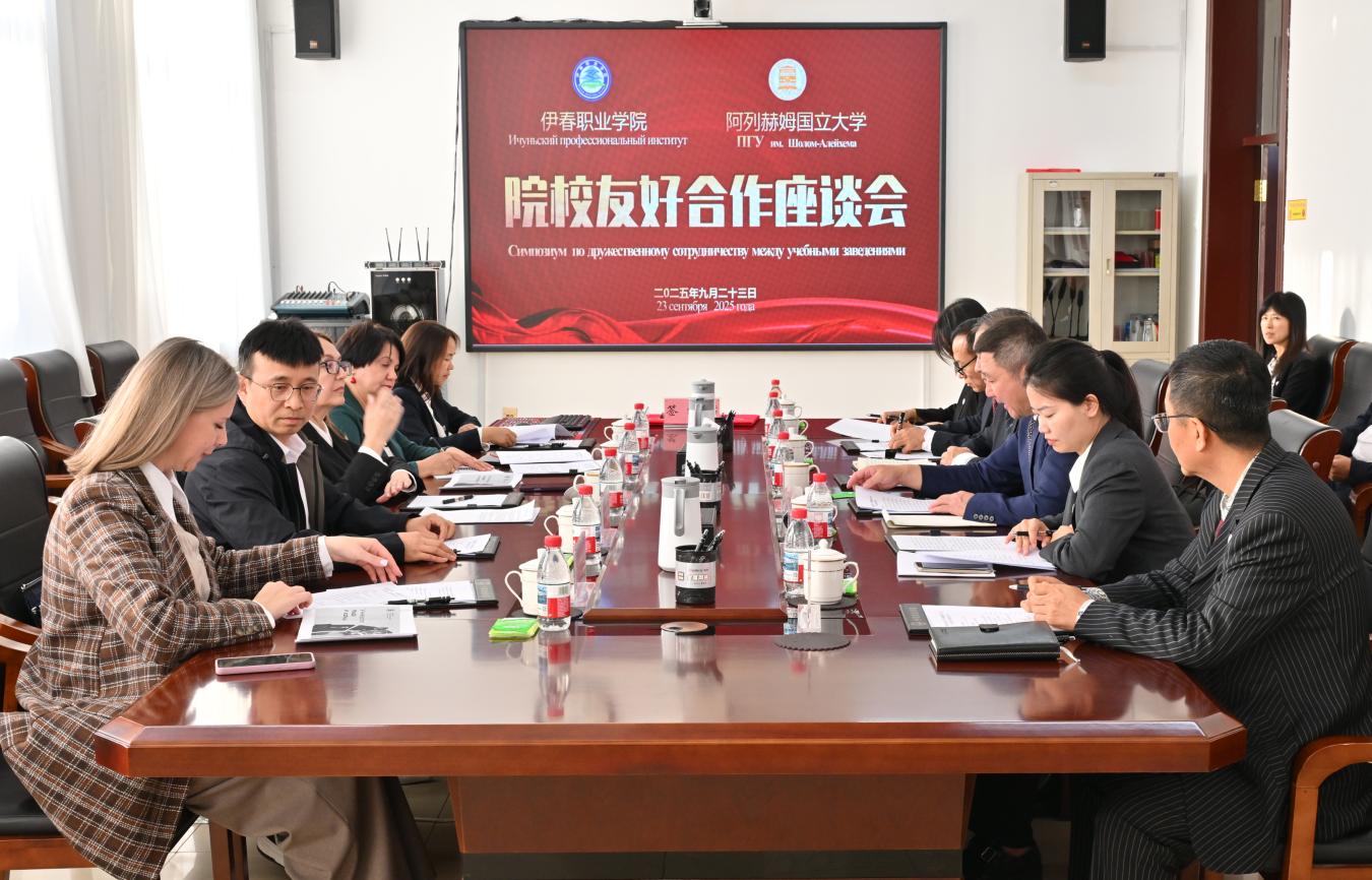 參觀結(jié)束后,雙方召開座談交流會(huì)。座談會(huì)上,王春海院長(zhǎng)致歡迎辭,同時(shí),介紹了學(xué)院的發(fā)展歷程和特色優(yōu)勢(shì)。他表示,2025年是學(xué)院高質(zhì)量發(fā)展邁入新階段的關(guān)鍵之年,學(xué)院將秉持“辦學(xué)能力高水平、產(chǎn)教融合高質(zhì)量”的標(biāo)準(zhǔn),持續(xù)推進(jìn)“雙高”建設(shè)。在這一重要時(shí)間節(jié)點(diǎn)上,與俄羅斯“肖洛姆-阿列赫姆”國(guó)立大學(xué)深入開展國(guó)際交流合作,對(duì)于學(xué)院拓寬全球化視野、推動(dòng)國(guó)際化辦學(xué)、響應(yīng)國(guó)家“職教出?!睉?zhàn)略,均具有極其重要的意義。巴熱諾娃校長(zhǎng)介紹了俄羅斯“肖洛姆-阿列赫姆”國(guó)立大學(xué)的發(fā)展歷史、學(xué)科特色以及學(xué)校在國(guó)際教育合作方面的成果。她表示,“肖洛姆-阿列赫姆”國(guó)立大學(xué)高度重視與中國(guó)高校的合作,期望以此次交流為契機(jī),進(jìn)一步鞏固和深化兩校間的友好合作關(guān)系,共同培養(yǎng)和共享技能人才,實(shí)現(xiàn)優(yōu)勢(shì)互補(bǔ)、合作共贏。