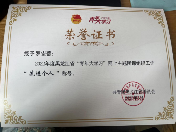 伊春職業(yè)學(xué)院護(hù)理學(xué)院輔導(dǎo)員羅宏蕾榮獲2022年度黑龍江省“青年大學(xué)習(xí)”網(wǎng)上主題團(tuán)課組織工作“先進(jìn)個(gè)人”稱號(hào)