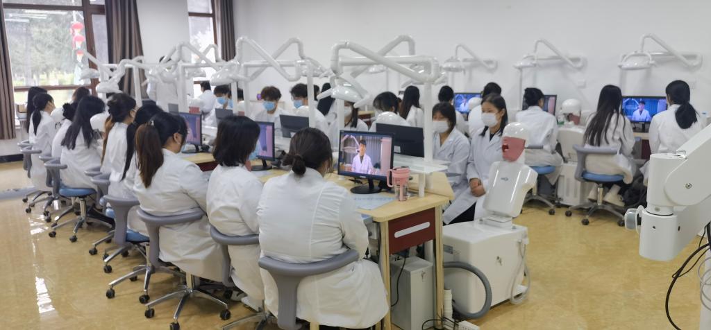 教師端信息的采集基于顯微鏡,從而搭建了一個(gè)高度仿真的虛擬 訓(xùn)練系統(tǒng),學(xué)生端的顯示器可同步再現(xiàn)教師在仿頭模上的清晰操作, 學(xué)生跟著教師同步訓(xùn)練;教師端主機(jī)播放口腔助理醫(yī)師實(shí)踐技能輔導(dǎo) 視頻,學(xué)生跟著操作,該實(shí)訓(xùn)室實(shí)現(xiàn)了口腔醫(yī)學(xué)專(zhuān)業(yè)教學(xué)的網(wǎng)絡(luò)化, 信息化、可視化,精細(xì)化,可提升學(xué)生口腔助理醫(yī)師技能考試的通過(guò)率,并為學(xué)生臨床頂崗實(shí)習(xí)奠定扎實(shí)基礎(chǔ)。