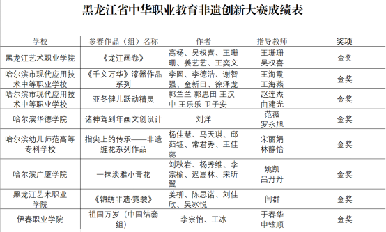 首屆黑龍江省中華職業(yè)教育非遺創(chuàng)新大賽共有20所院校、82個項目、391名師生參加現(xiàn)場決賽,分為工藝美術(shù)組和演藝組兩組進行評比,參賽團隊按照賽場分區(qū)搭建展臺,評審專家根據(jù)現(xiàn)場觀摩和座談評議情況進行打分。最終,8個項目榮獲金獎、16個項目獲銀獎、20個項目獲銅獎。